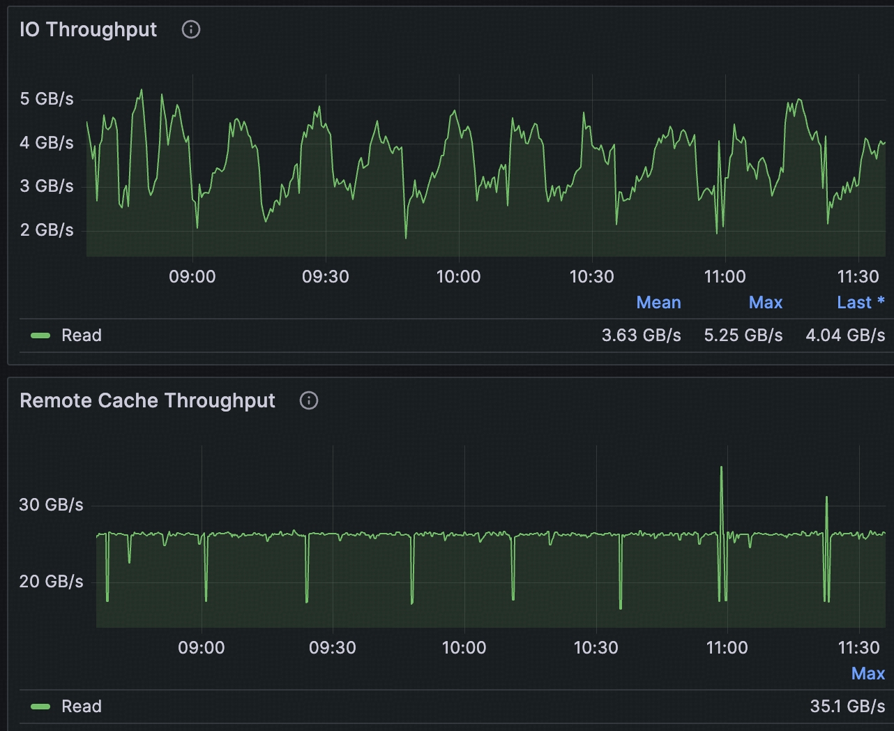 从下图监控数据可见,用户侧接收到的读带宽仅在 3–5 GB/s 区间波动,而后端 Remote Cache 的吞吐能力稳定维持在 25 GB/s 左右,且带宽曲线平稳,表明后端资源已逼近性能上限。二者之间的差距主要源于 JuiceFS 的 readahead 策略 —— 系统预读取的数据远超用户实际所需,导致读放大严重,带宽浪费严重。这意味着为了满足当前的读取需求,系统不得不付出数倍的额外成本。