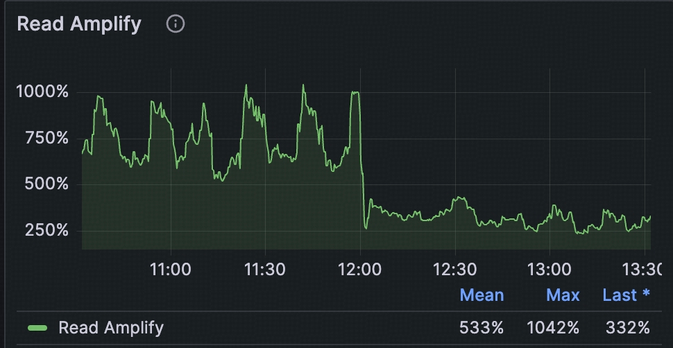 下图展示了优化前后的系统读放大变化。优化前,读放大率一度高达 1042%,意味着系统为了读取实际所需数据付出了 10 倍以上的 IO 成本。优化之后,读放大显著下降,长期稳定在 300% 左右,系统读取效率和带宽利用率均得到显著提升。
