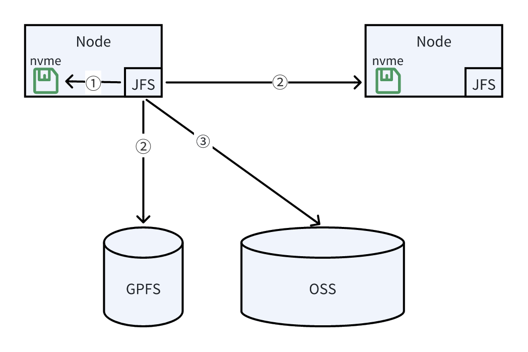 其次,我们进行了二次开发工作,保留了本地盘的支持,构建了二级缓存机制。数据优先从本地 NVMe 硬盘读取;若本地未命中,则回退访问 GPFS 或 OSS。这一策略显著提升了读性能,尤其在数据访问具有局部性的场景中,有效降低了访问延迟。