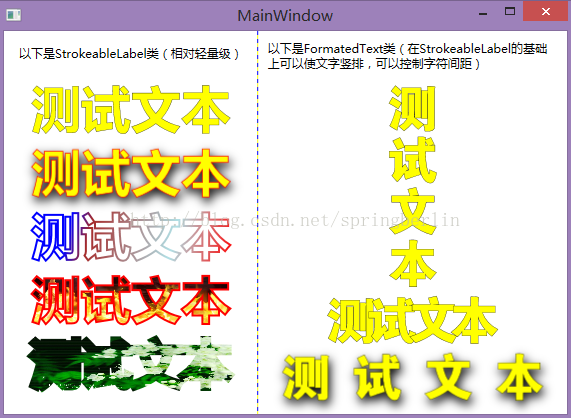 <wpflib:FormatedText StretchSize="-5" TextOrientation="Vertical" HorizontalAlignment="Center" Text="测试文本" Fill="Yellow" Stroke="Black" StrokeThickness="0.3" FontWeight="Bold" FontSize="50"/>