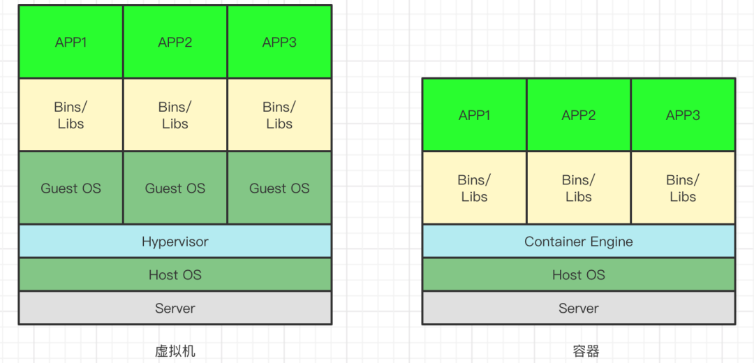 既然容器是为应用程序提供封装与隔离,那为什么不用虚拟机呢?我们首先来看下二者的对比: