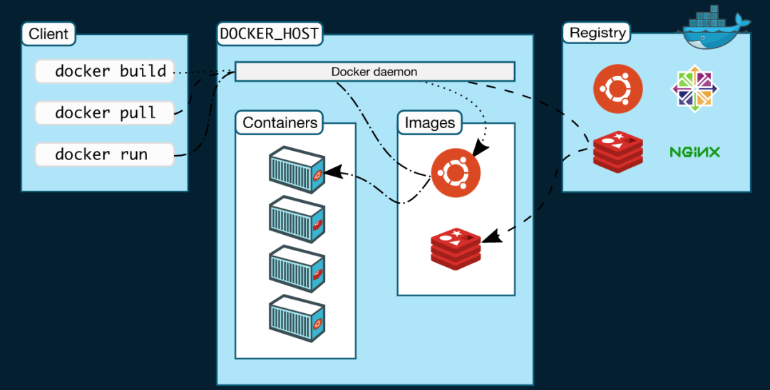 Docker deamon以Linux后台服务方式运行,监听并处理来自客户端的请求,并管理诸多Docker对象(镜像、容器、网络和存储)。