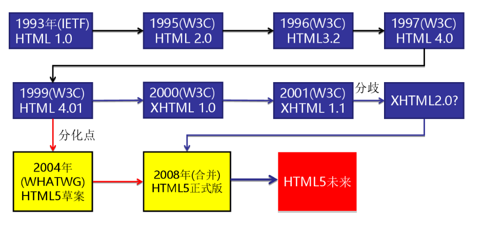*不推荐:*#### 5.5 html5发展之路  #### 5.6 什么是XHTML XHTML 是更严格更纯净的 HTML 代码。 - XHTML 指**可扩展超文本标签语言**(EXtensible HyperText Markup Language)。