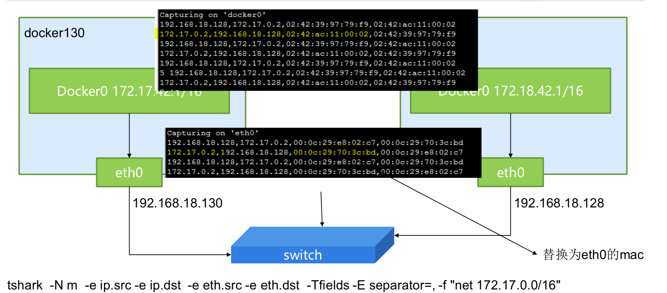 Docker130上的容器 c1:172.17.0.1 ping 128上的容器c2:172.18.0.1时,c1发现这个地址不是自己子网的,于是发 给docker0网关