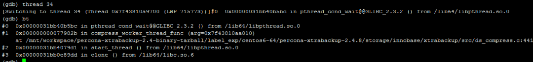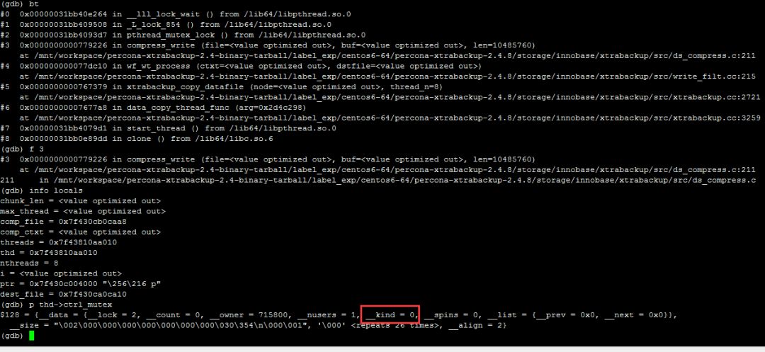 我们看到7# 线程hang死的位置与2号线程是相同,不同的是 它是卡在第3个压缩线程上,且其ctrl_mutex的owner为空。也就是说没有与其竞争的线程,它自己就一直在这等。