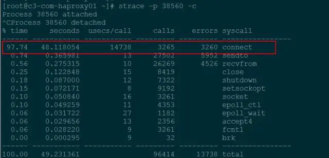 2. 通过 strace -p pid -c 查看HAProxy 进程那个系统调用占用cpu 最多,看到cpu 都用在了 connect系统调用上。