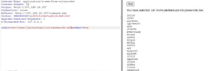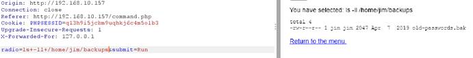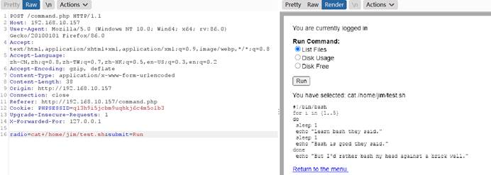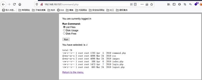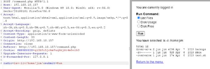 来到command.php文件,发现可以执行系统命令,猜测是通过post请求控制执行的系统命令,使用bp抓包