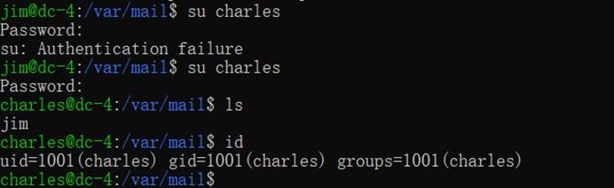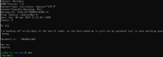 然后在var/mail目录下发现了jim的邮件信息,里面给出了charles的密码,这个权限可能要比jim高