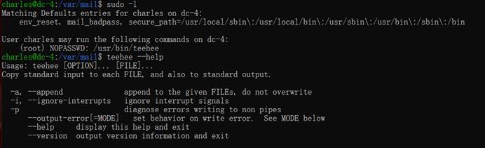 Sudo -l查看当前的权限,但是不知道teehee是什么,查看帮助,-a 可以写入文件内容并不覆盖文件原有内容。然后百度teehee提权