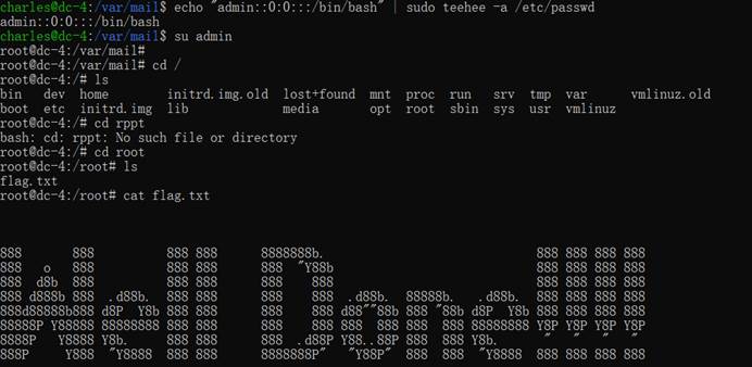 使用teehee命令将一个无密码用户admin写入到/etc/passwd文件,并加入到root组中