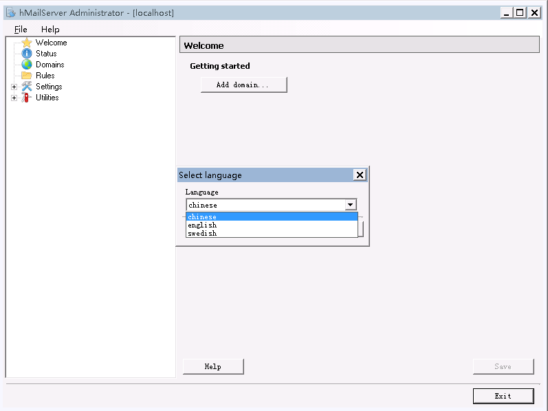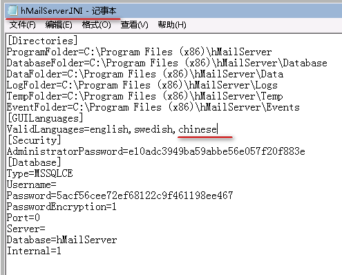 修改在安装目录中的bin\hMailServer.INI文件, [GUILanguages] ValidLanguages=english,swedish字段后面添加chinese