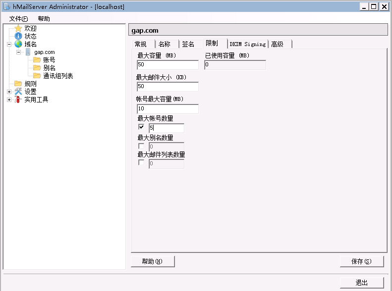 若有需要的话,可以对邮箱的存储空间和单篇邮件大小等参数设置限制