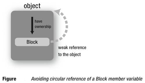 为了避免这种情况发生,可以在变量声明时用 __weak 修饰符修饰变量 self,让 block 不强引用 self,从而破除循环。iOS4 和 Snow Leopard 由于对 weak 的支持不够完全,可以用 __unsafe_unretained 代替。