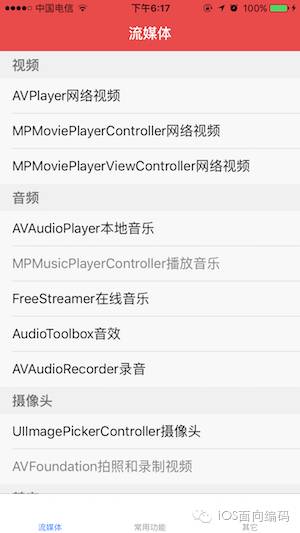 整理iOS开发中使用的各种流媒体和常用的高级功能。由于时间关系,目前只写了一部分功能,全部都采用的是系统方法,没用第三方,截图如下: