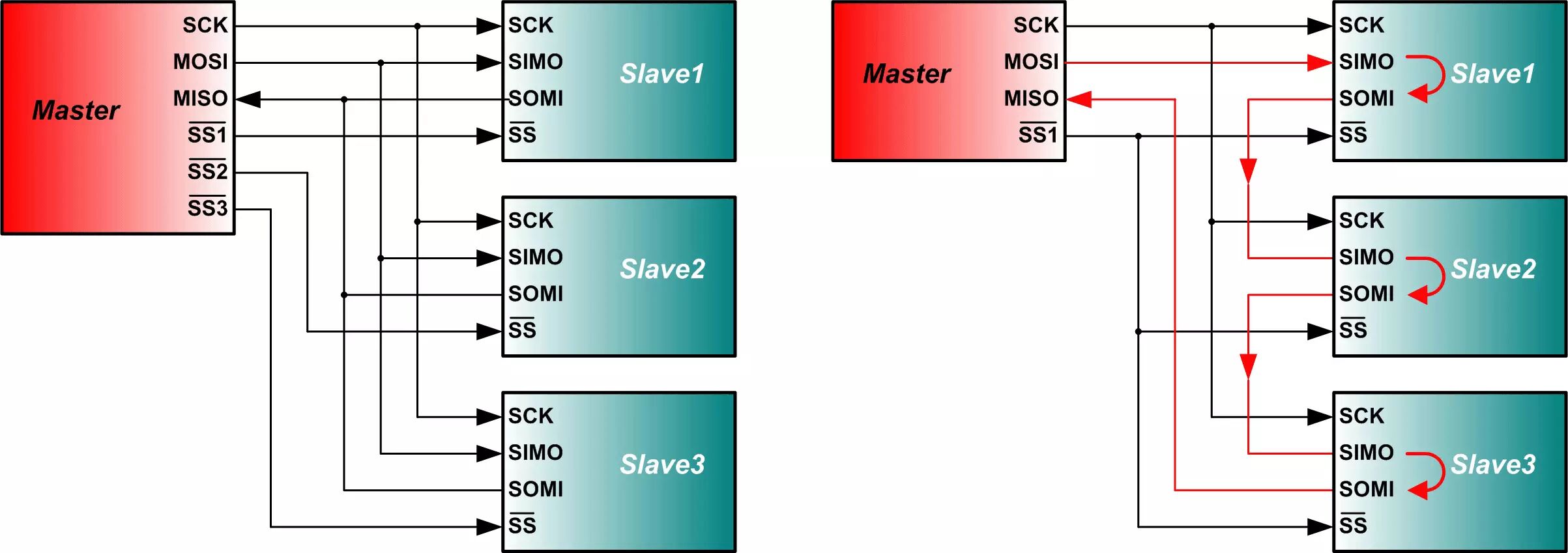 图 4:主控制器与独立从设备(左)及菊花链从设备通信(右)