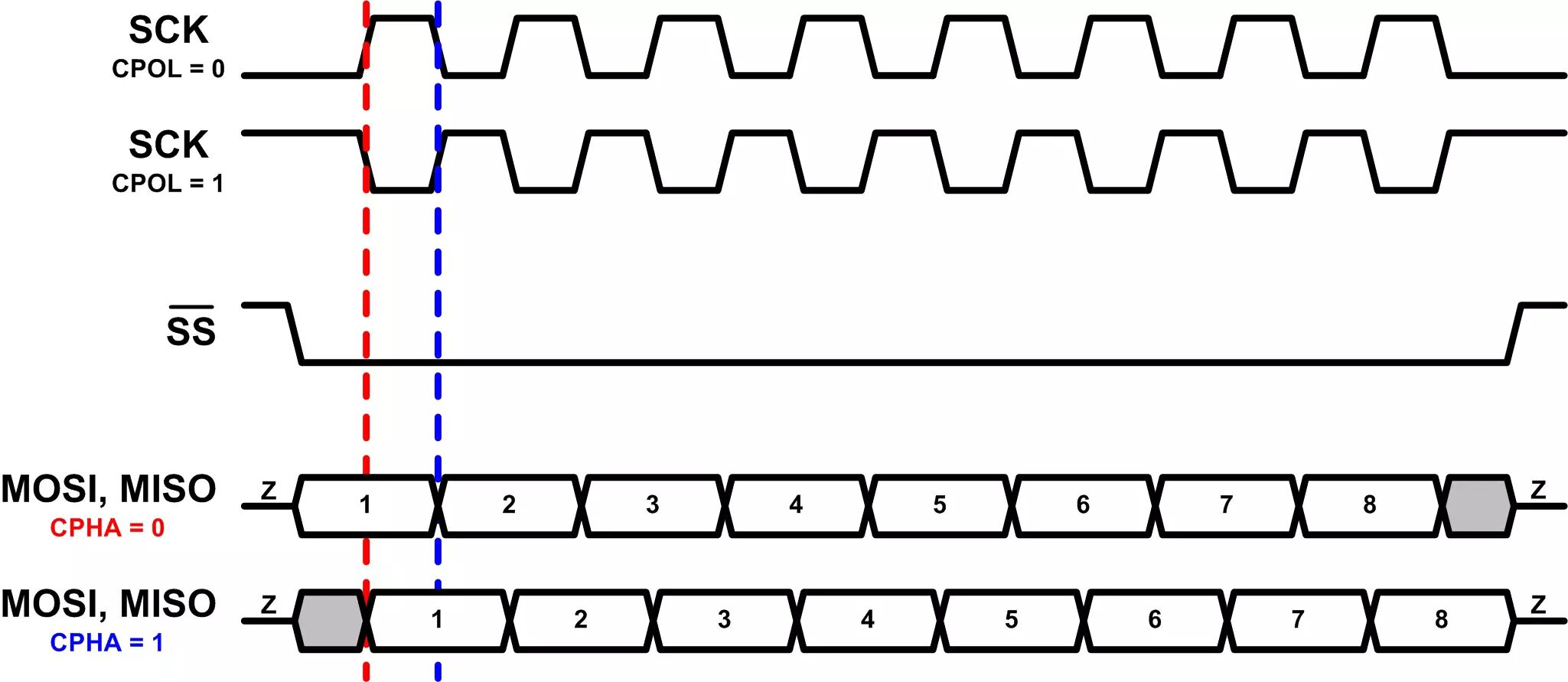 如果CPHA=1,数据在SCK的下降沿读取,在上升沿变化。