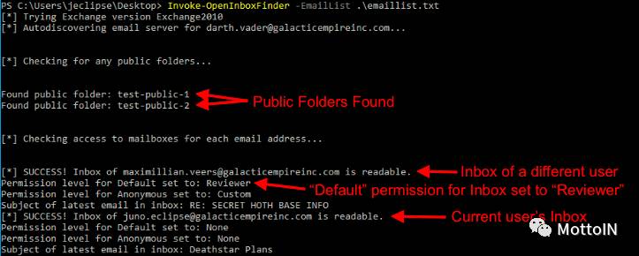 在下面的示例中,命令终端以名为”jeclipse“的域名用户名运行。再从域中的电子邮件列表中运行Invoke-OpenInboxFinder后,发现了两个公用文件夹。此外”jQuery“可以访问”maximillian.veers@galacticempireinc.com“的收件箱。Invoke-OpenInboxFinder将会打印出每个项目的权限级别。在输出中可以看到”Default“项设置为”Reviewer“。