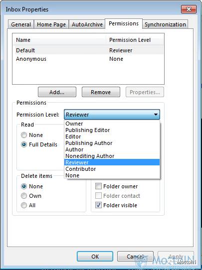 单击“权限”选项卡能看到文件夹当前的设置。这使得事情变得有趣了。单击“添加”按钮,用户可以指定某个账户来授予各种权限。这是非常理想的,因为用户能够限制特定人员的访问。但是你会注意到在“权限”中已经包含了“默认”和“匿名”选项。“默认”项目实质上已经包含了组织中的具有访问邮件权限的每个用户。