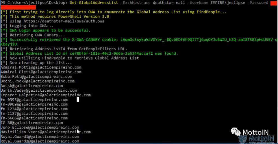 我已经在MailSniper中添加了一个名为Invoke-OpenInboxFinder的功能,以帮助查找具有设置允许其他用户访问的权限的邮箱。想使用它,我们首先要从目标环境中收集一个电子邮件地址列表。MailSniper有一个名为”Get-GlobalAddressList“的模块,可用于从Exchange服务器检索全局地址列表。它将尝试Outlook Web Access(OWA)和Exchange Web服务(EWS)的方法。此命令可用于从Exchange收集电子邮件列表:
