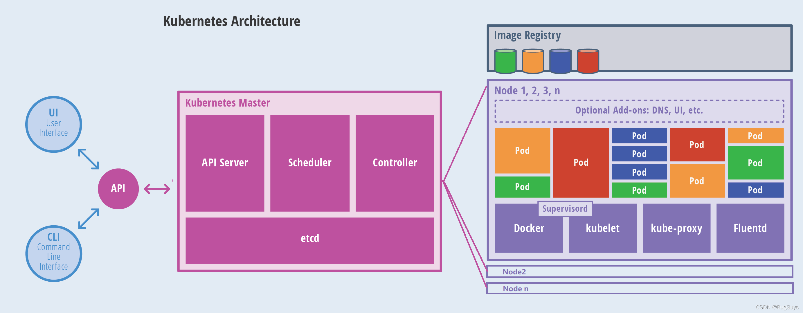 - 接口层:kubectl 命令行工具、客户端 SDK 以及集群联邦;