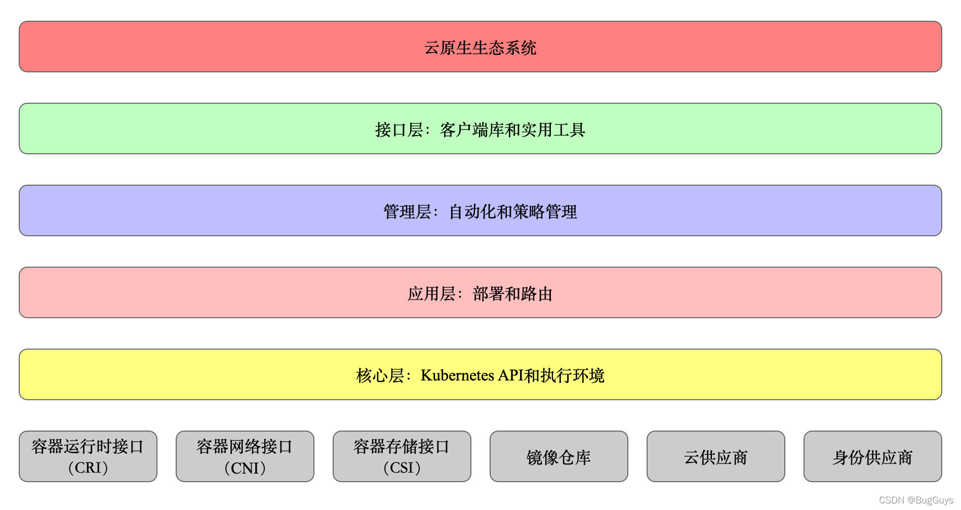 - 管理层:系统度量(如基础设施、容器和网络的度量),自动化(如自动扩展、动态 Provision 等)以及策略管理(RBAC、Quota、PSP、NetworkPolicy 等)、Service Mesh(部分位于管理层);