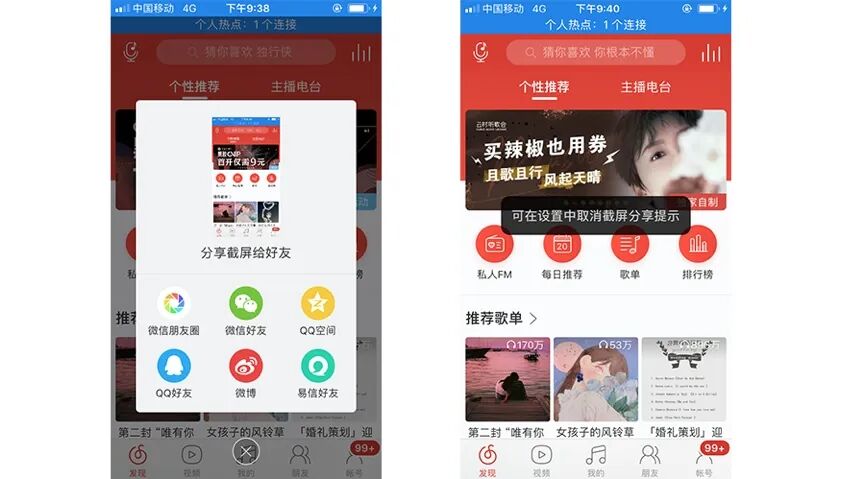 网易云音乐新改版的截图分享功能,是在用户进行截图操作之后会浮出分享浮层。虽然出现3秒就会消失,但是为了避免给用户带来过多的干扰,还在设置页面加入了功能开关,并且在用户点击浮层上的叉之后利用toast半透明遮罩告诉用户“可在设置中取消截图分享”。更为贴心的是,这种toast提示在用户第一次进行点击叉号操作之后会出现,之后每累积点击3次才会出现1次。