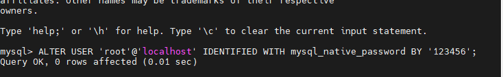 修改root密码 ALTER USER 'root'@'localhost' IDENTIFIED WITH mysql_native_password BY '123456'; 其中123456是新的密码自己设置
