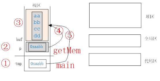 上面的程序,在getMem函数中,在栈区分配128字节的内存空间,在函数执行完毕返回后,将buf析构掉(浅粉色表示),并且,buf做指向的内存空间也被析构(灰色表示)。