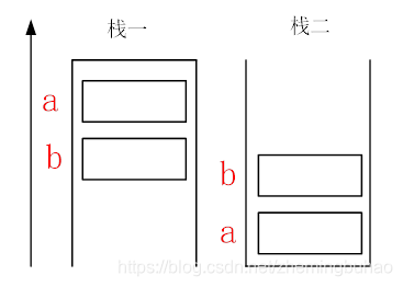 可以简单的进行测试,首先假设一个虚拟的方向轴,那么,在图3所示的效果中,左边的栈一代表开口方向向下,右边栈二代表开口方向向上,那么,根据先进后出的特性,如果b的地址小,那说明栈的开口方向向下。