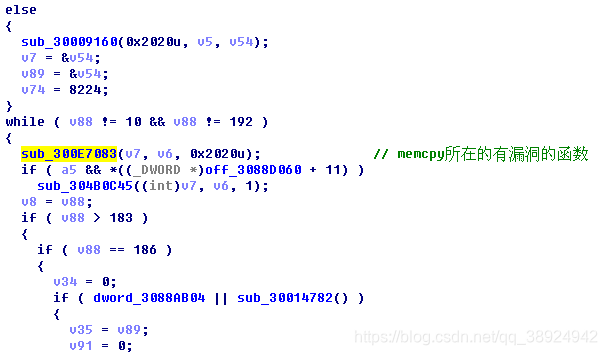 - 起初一开始参照资料上说对 memcpy 复制的值进行了过滤,来看一下伪代码;图中划红线的地方就是漏洞触发的函数,memcpy 的第三个参数(复制数据的大小)就是 a2 传进来的,当 a2 > a3 时就不会执行下面的 memcpy 漏洞函数(经过反复调试的结果)