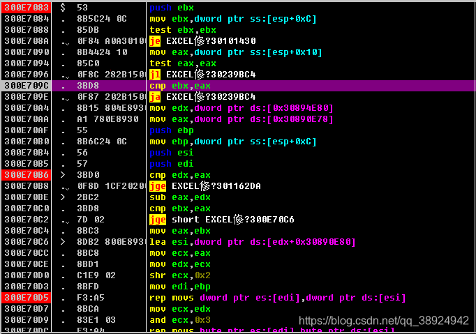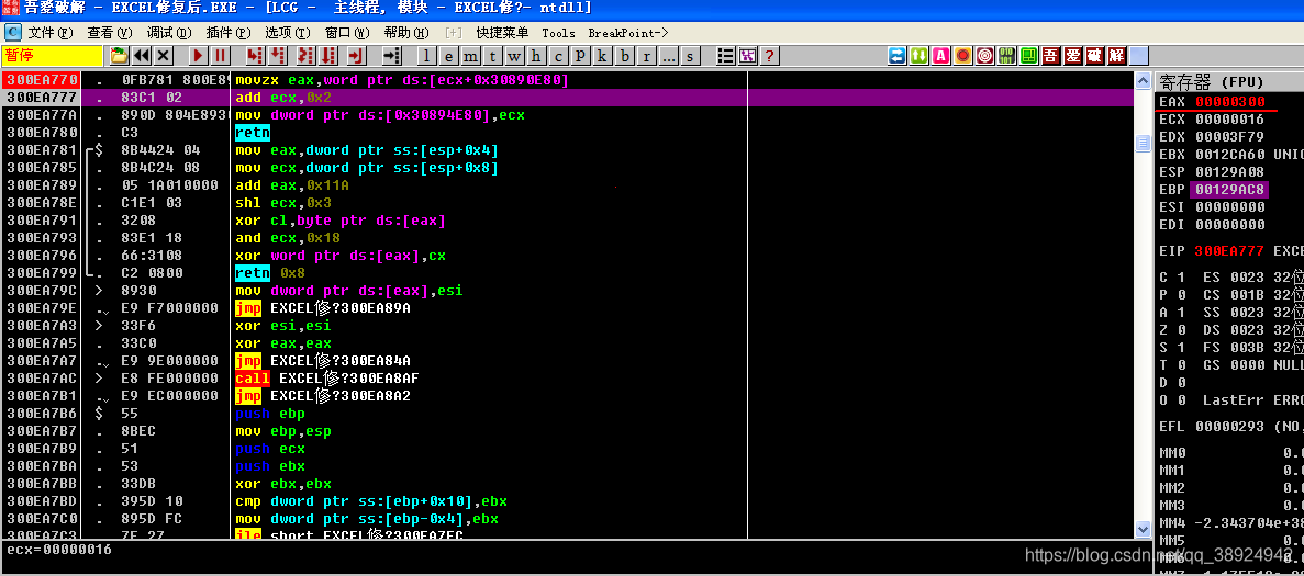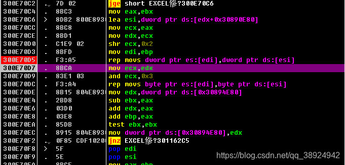 - 还是动手调试一下,没准又是一个新漏洞,这时的 EAX 为 300,300 就是 POC 样本中的数据,也是复制数据大小的参数