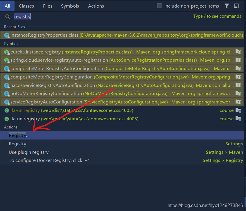 第三步、双击shift按键(默认是两次shift),会出来一个搜索框,搜索registry,点击action第一个