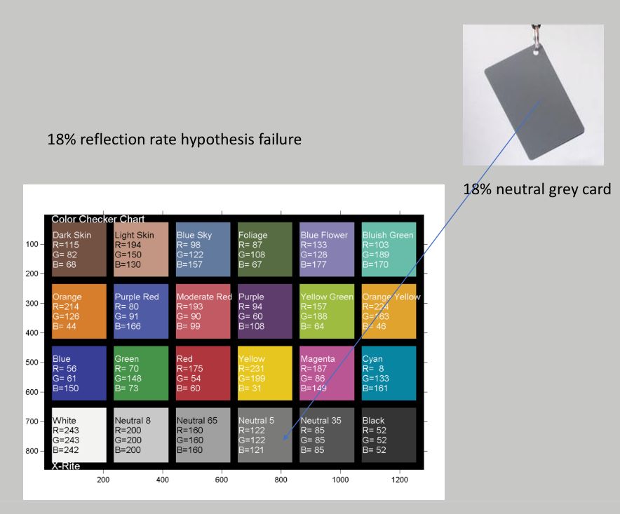 下图左上角的灰卡实际是18%反射率的色卡,但是由于背景全白,出现了视觉误差,为了视觉上将其纠正为18%灰,就必须增大亮度。
