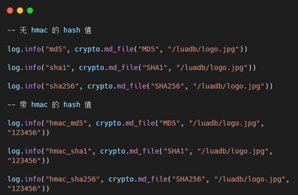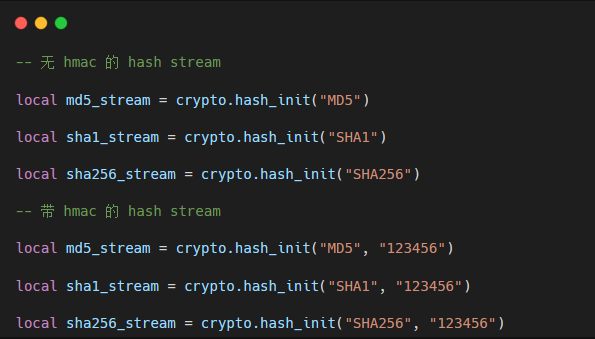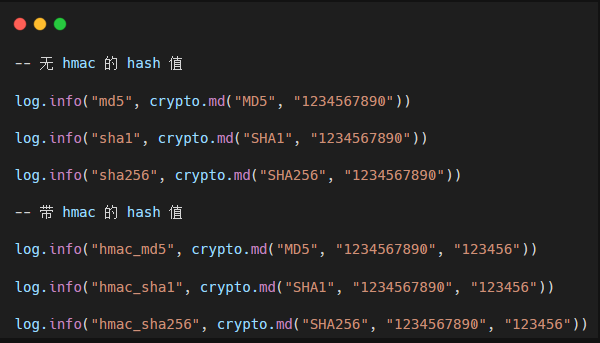 通过本章内容的学习,你可以学习到有关加解密算法的函数,例如:crypto.md5(str)、crypto.hmac_md5(str,key)、crypto.hmac_sha1(str,key)等等函数。