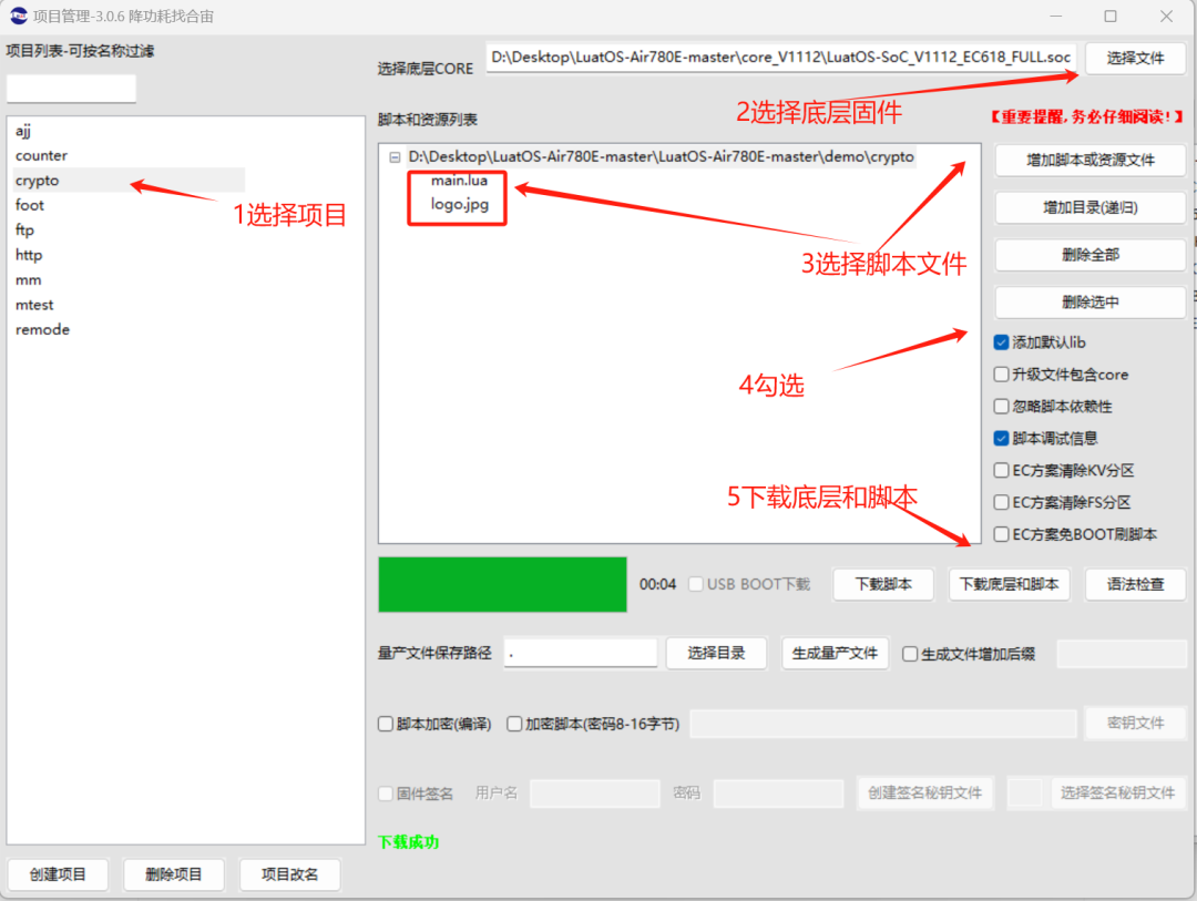 选择780E板子对应的底层core和刚改的main.lua脚本文件.下载到板子中.