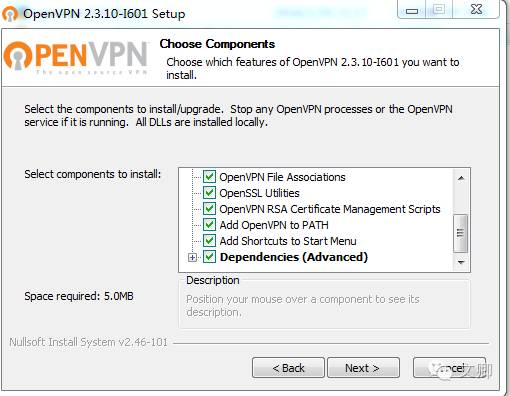 面,把所有的组件全部选上,这样软件便安装在了C:\Program Files\OpenVPN目录中,并且添加到了服务中。