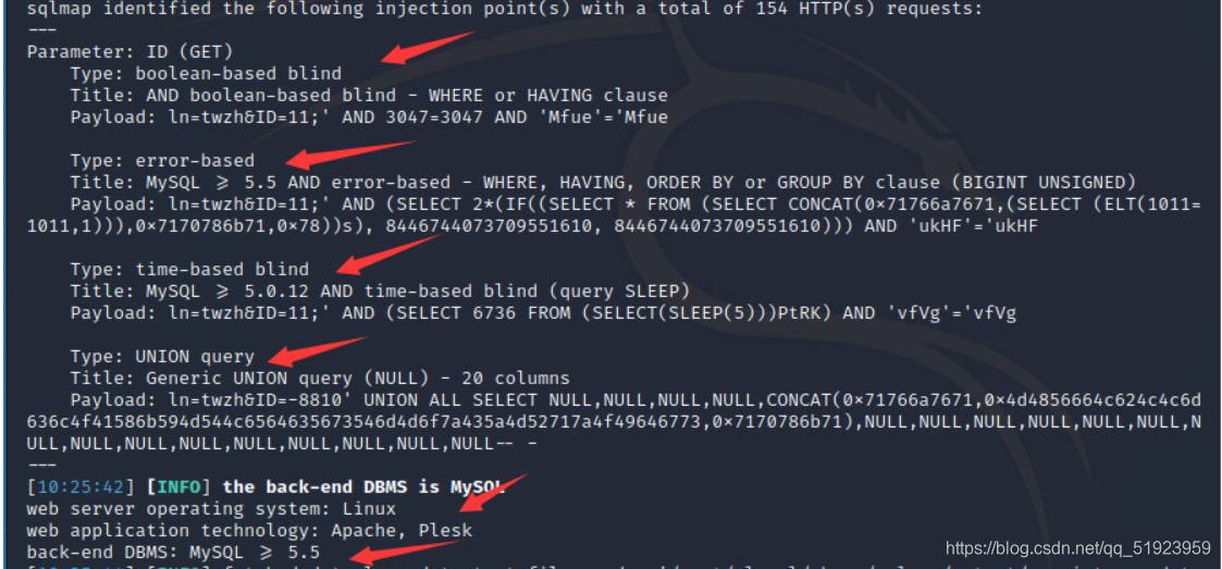 加上id之后跑出来结果如下,发现这个漏洞也太多了吧,布尔盲注、报错注入、延迟注入、联合注入都有问题。然后看一下用的是mysql5.5以上的数据库,系统是linux。