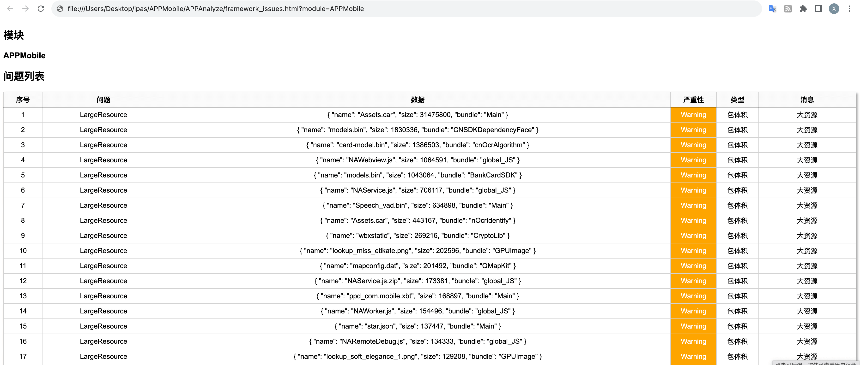 app_issues.html- 展示ipa每个framework的包体积待修复问题数量,可直接用浏览器打开。