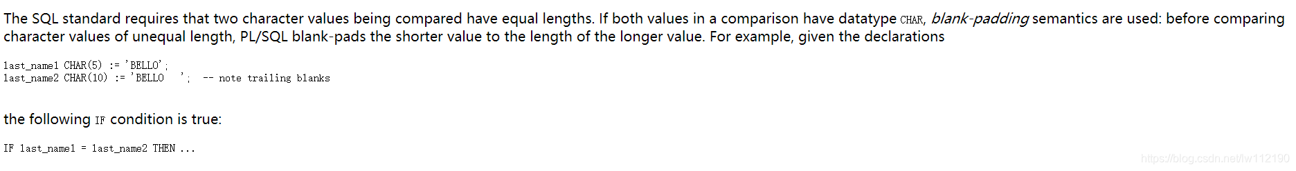 SQL 标准要求被比较的两个字符值具有相等的长度。如果比较中的两个值都具有数据类型CHAR,使用空白填充语义:在比较不等长的字符值之前,PL/SQL 将较短的值空白填充到较长值的长度.