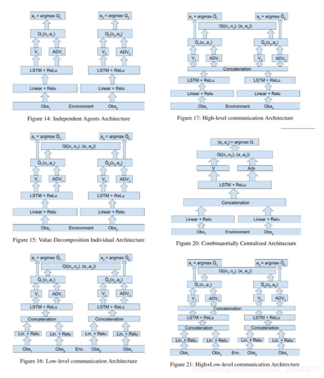 我们可以看到,实验为了减小 value decompostion 带来的误差,显式加入了通信模块,并分为高层通信以及低层通信(低层通信其实是互相共享局部观察),不同 baseline 具体网络结构以及部分实验结果对比如下图所示(图片来源原论文):