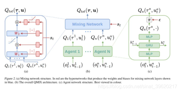 为了使得学到的联合 Q 函数以及局部 Q 函数满足上述条件,QMIX 使用了如下包含 agent network、mixing network 以及 hypernetworks 的架构(图片来源原论文),注意到,QMIX 由于 mixing network 是一个非线性网络的原因,其表达能力因而超过 VDN: