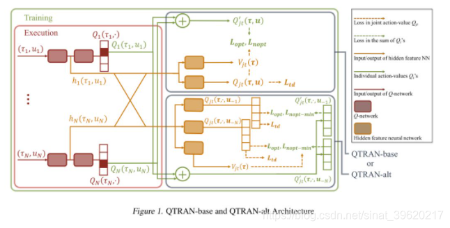 为了满足上述定理,QTRAN 提出了两个算法 QTRAN-base 以及 QTRAN-alt,下面是这两个算法的结构图(图片来源原论文):