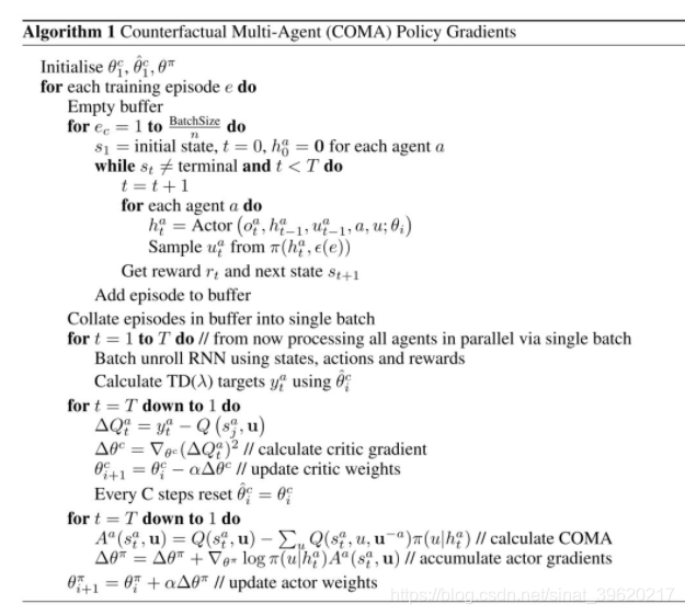 COMA 使用的是 vanilla 的 actor-critic 方法,其核心之处在于引入了一个 counterfactual 的 baseline 函数。这个思路是受到 difference rewards 方法启发的(具体可参见 [4] [5]),该方法通过比较智能体遵循当前 actor network 进行决策得到的全局回报与遵循某个默认策略进行决策得到的全局回报,来解决多智能体信用分配问题。