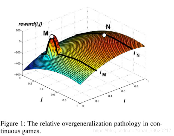 考虑一个如下图所示的 continuous game, 坐标轴是两个智能体能够采取的动作,曲面代表联合动作对应的全局回报。虽然联合动作 相比于联合动作 拥有更高的全局回报,但是对于智能体 来说,执行动作 带来的期望收益要低于执行动作 带来的期望收益,那么整体就会收敛到 (次优)点。