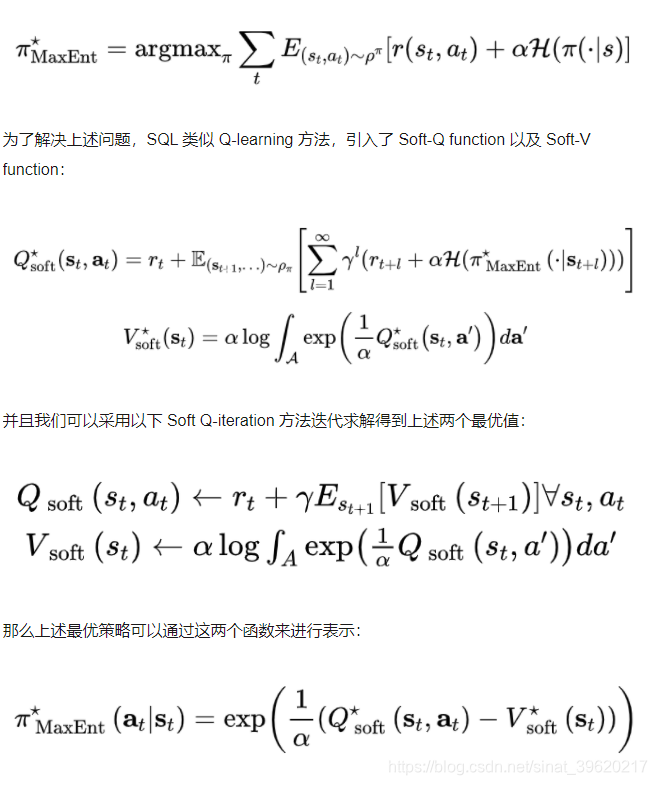 SQL 方法目的在于解决最优策略不是唯一的的任务,因而尝试学习一个最优策略的分布,从而学到所有可能的最优策略。为了实现这个目标,其实是求得下列优化问题的最优解: