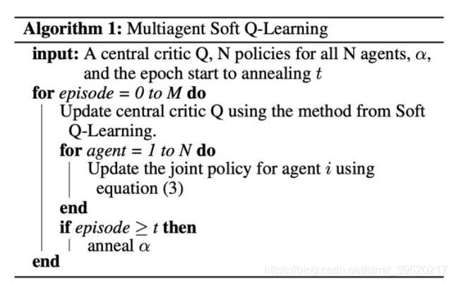 因而 SQL 方法需要学习一个 Q function 以及 policy,可以被看作是一个 actor-critic 方法(但与实际的 actor-critic 方法还是不同的,将其看作 AC 方法只是为了能够实现 CTDE 框架)。接下来我们将其扩展到多智能体环境中,具体算法伪代码如下:
