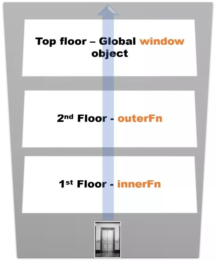 建筑的顶层就是全局 windows 对象。如果你现在在一楼,你就可以看到并访问那些放在楼上的东西,比如放在二楼的 outerFn 和放在三楼的 window 对象。