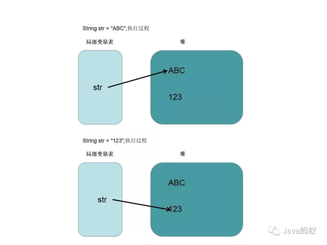 这里存在一个误区:str只是一个String对象的引用,并不是对象本身。对象在内存中是一块内存区,放在堆中,成员变量越多,这块内存区占的空间越大。引用只是一个4字节的数据,里面存放了它所指向的对象的地址,通过这个地址可以访问对象,而这个引用存放在Java虚拟机栈栈帧的局部变量表中。也就是说,str只是一个引用,它指向了一个具体的对象,当str=“123”; 这句代码执行过之后,又创建了一个新的对象“123”, 而引用str重新指向了这个新的对象,原来的对象“ABC”还在内存中存在,并没有改变。